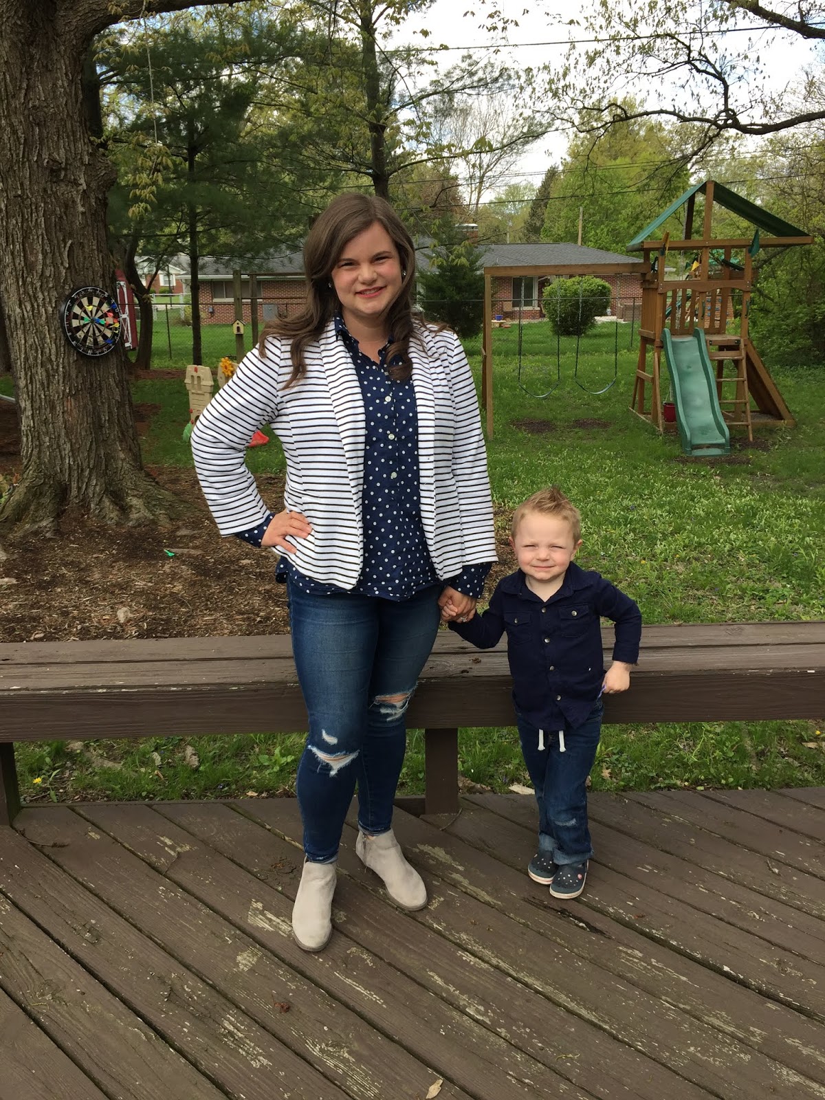 Long live this trend!!  I just love it years after it became a thing.  I love this striped blazer and button down polk-dot top.  Both are old from Old Navy.  We are all dressed and ready for church.